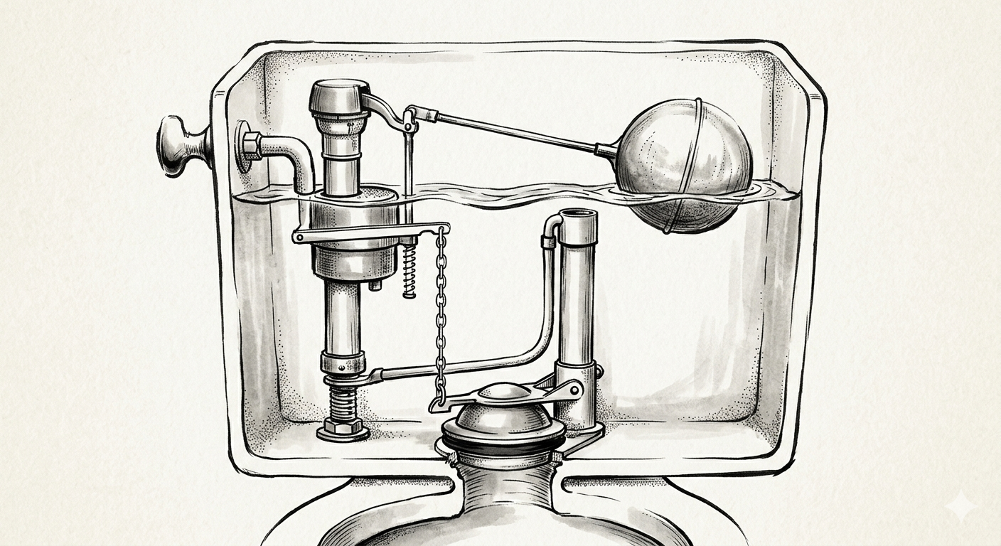 El sistema utiliza una esfera hueca (el flotador) conectada a una palanca que acciona una válvula. A medida que el nivel del agua sube, el flotador se eleva; al llegar al nivel deseado, la palanca cierra la entrada de agua por completo.